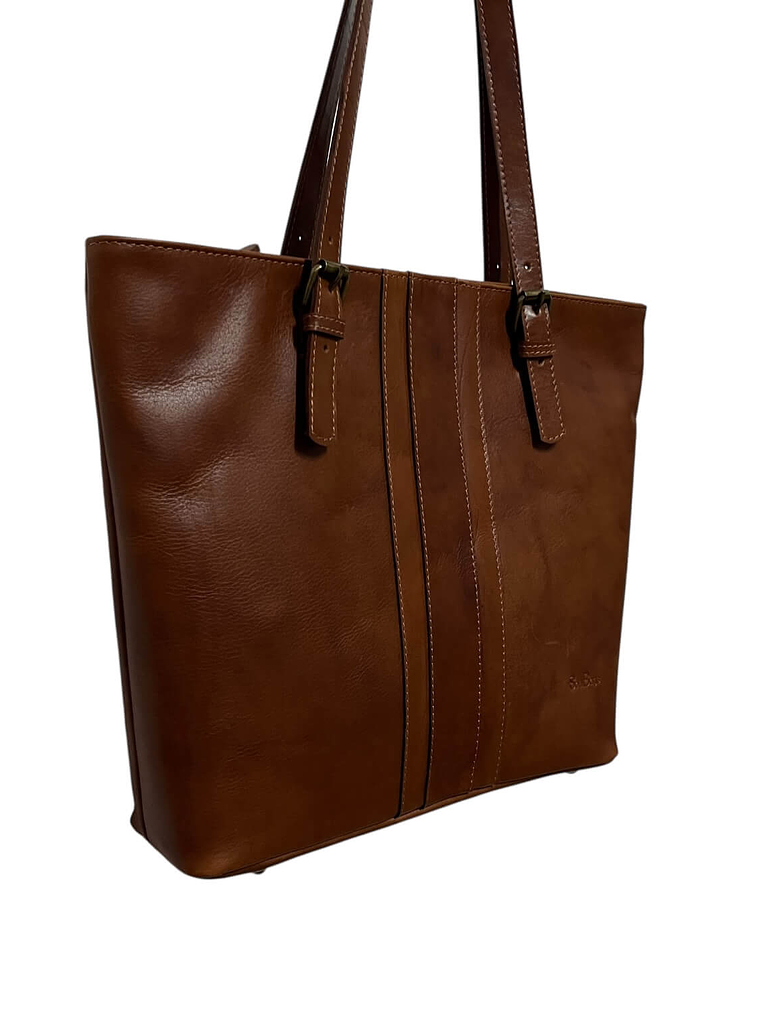 Cartera de Cuero con asas y correa ajustable-removible. Internamente forrada en tela con una división interior y 2 bolsillos interiores (uno de cuero y otro con cierre). Tiene un bolsillo con cierre en parte posterior.