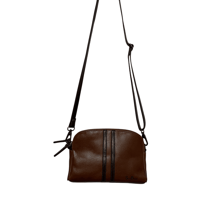 Cartera de Cuero con 2 divisiones cada una con cierre metálico. Asa en cuero color castagno, larga y ajustable. Bolsillo con cierre metálico en parte posterior. Internamente forrada en tela y un bolsillo con cierre.