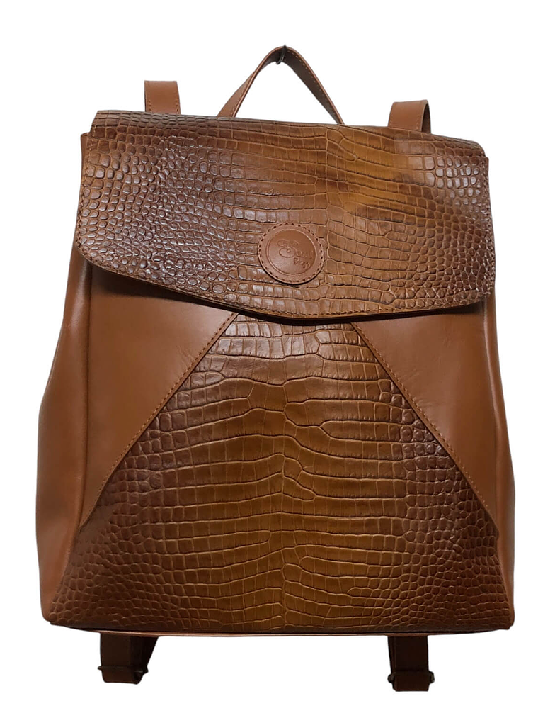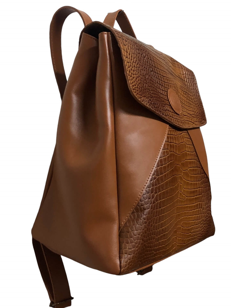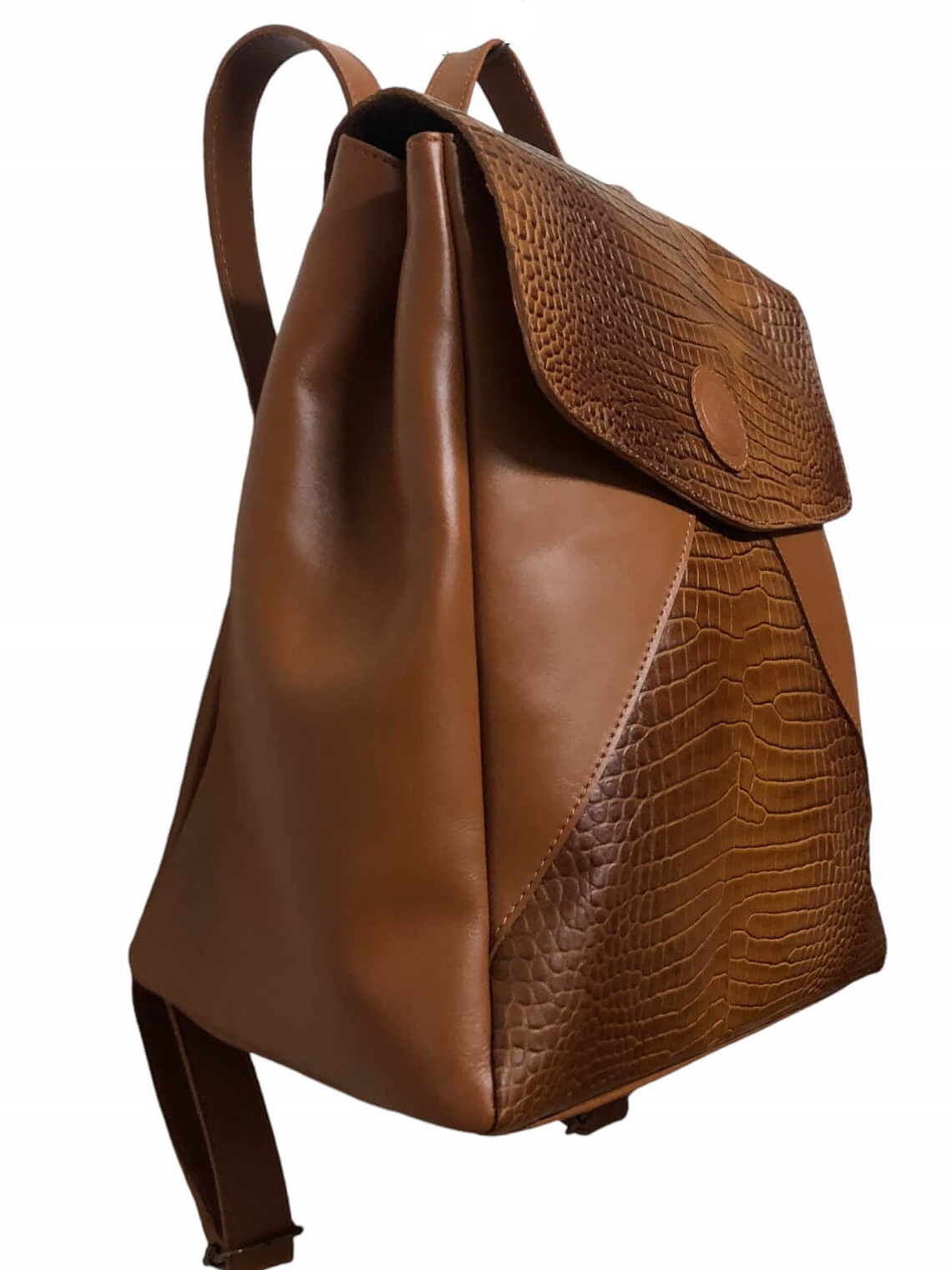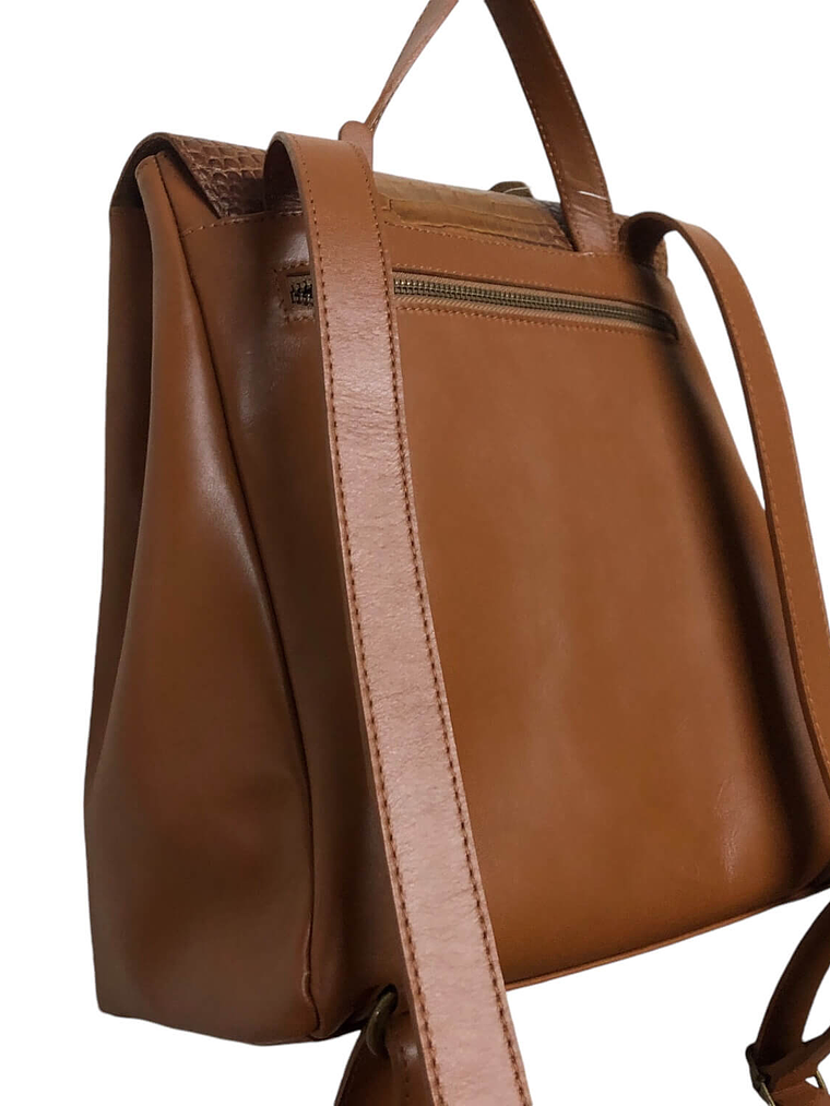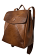 Mochila de cuero. Otro bolsillo con cierre atrás. Correas ajustables.